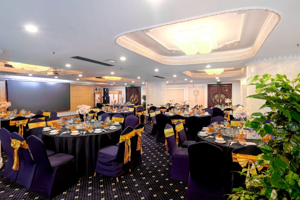 • Sảnh tiệc rộng rãi, linh hoạt quy mô: Khách sạn sở hữu không gian tổ chức tiệc đa dạng, phù hợp từ những buổi tiệc ấm cúng, riêng tư đến các lễ cưới quy mô lớn.
