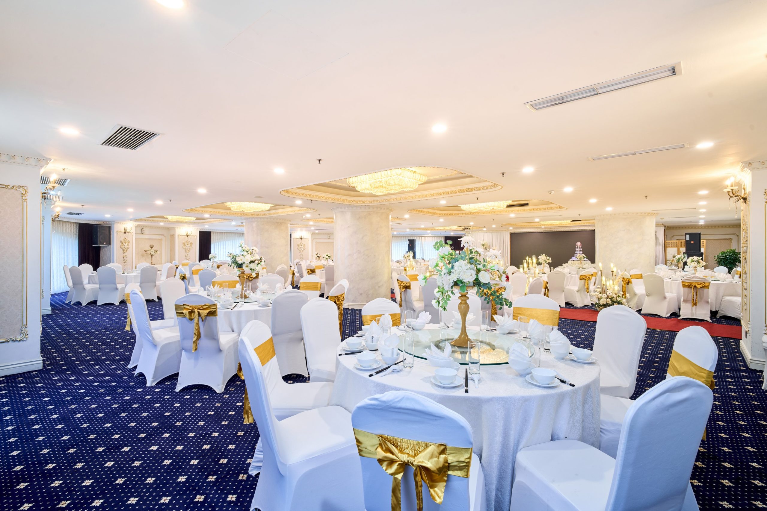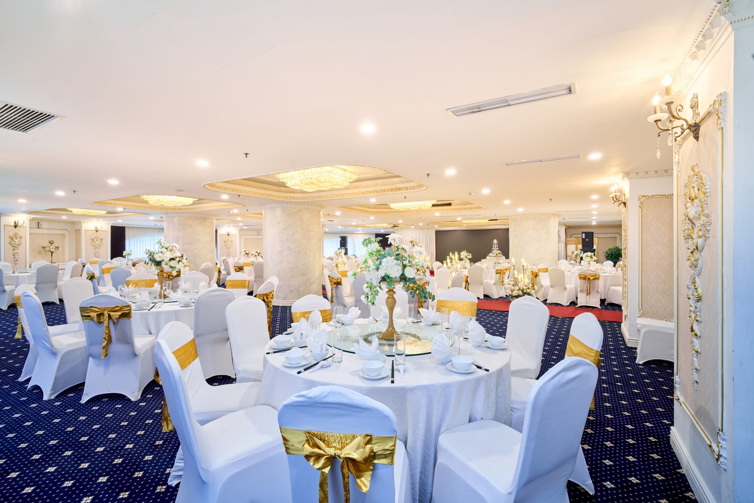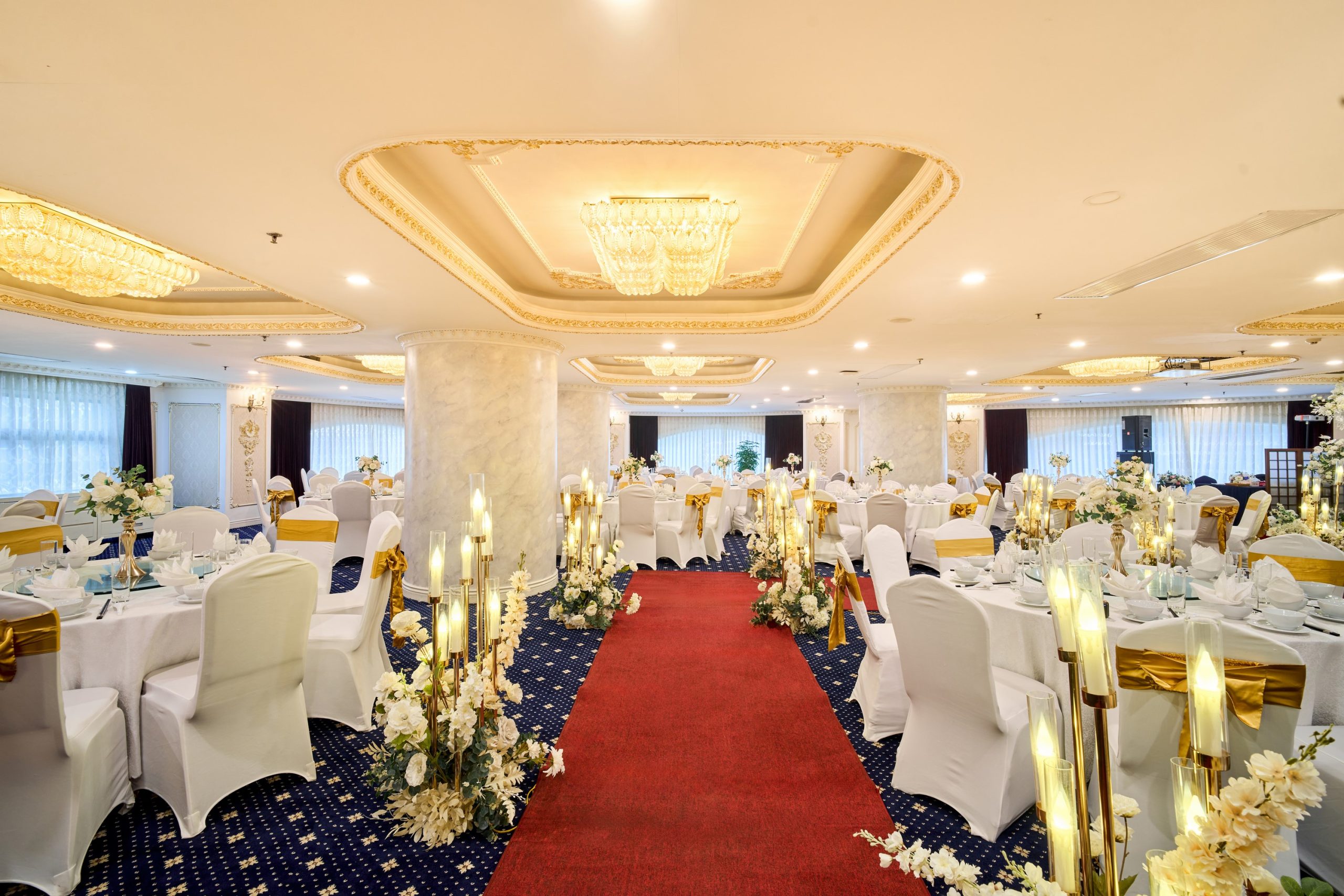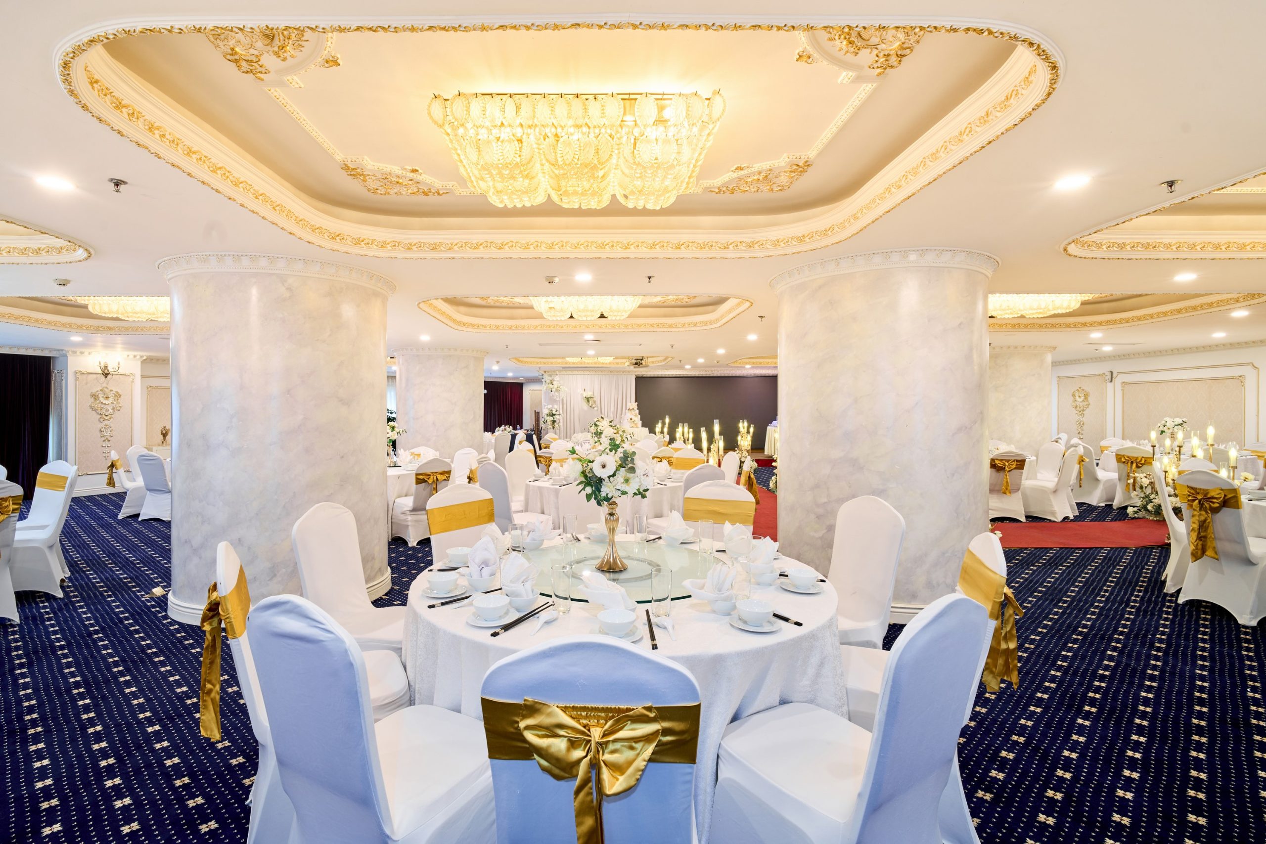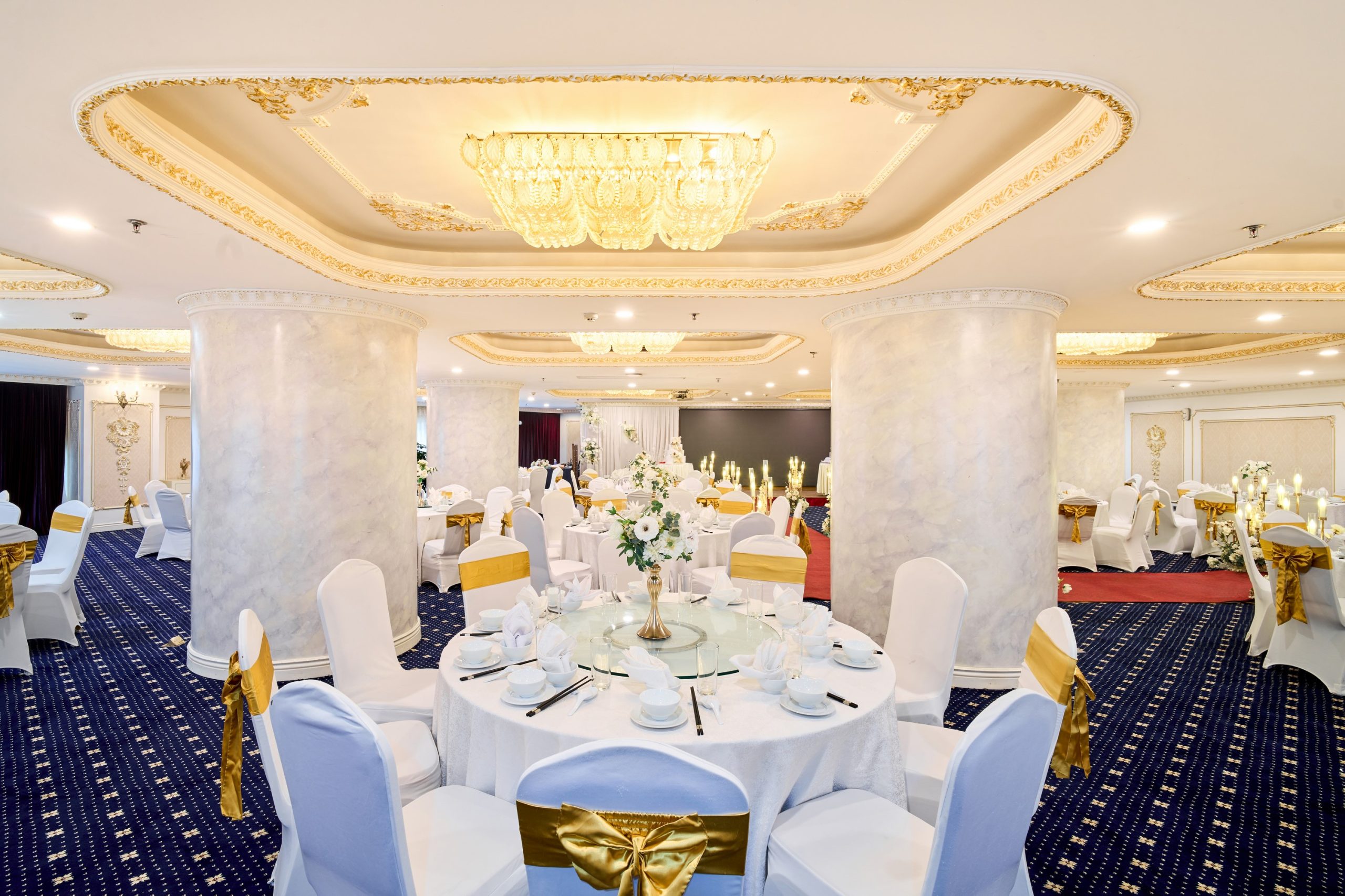 Tưởng tượng bạn và người thương bên nhau trong không gian trần cao, đèn chùm pha lê lấp lánh, và những chi tiết trang trí sang trọng, tạo nên khung cảnh đẹp như mơ cho ngày hạnh phúc.