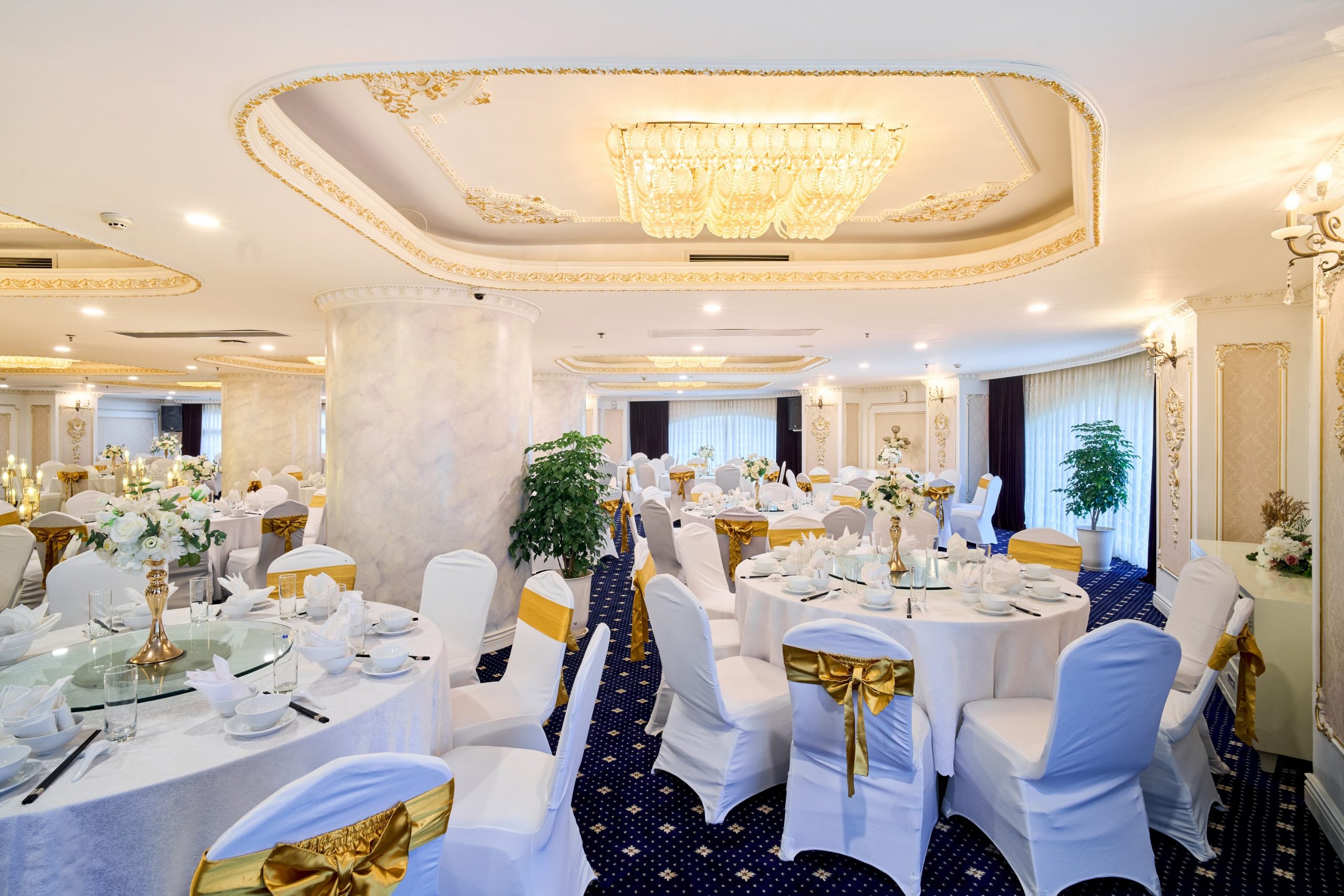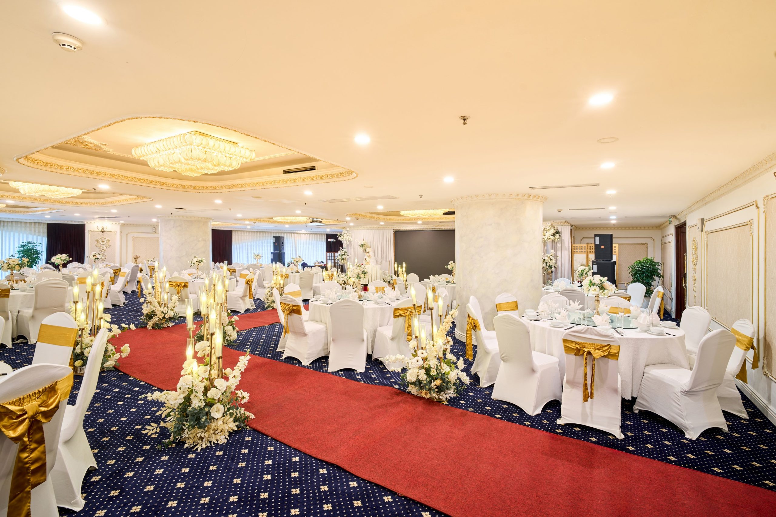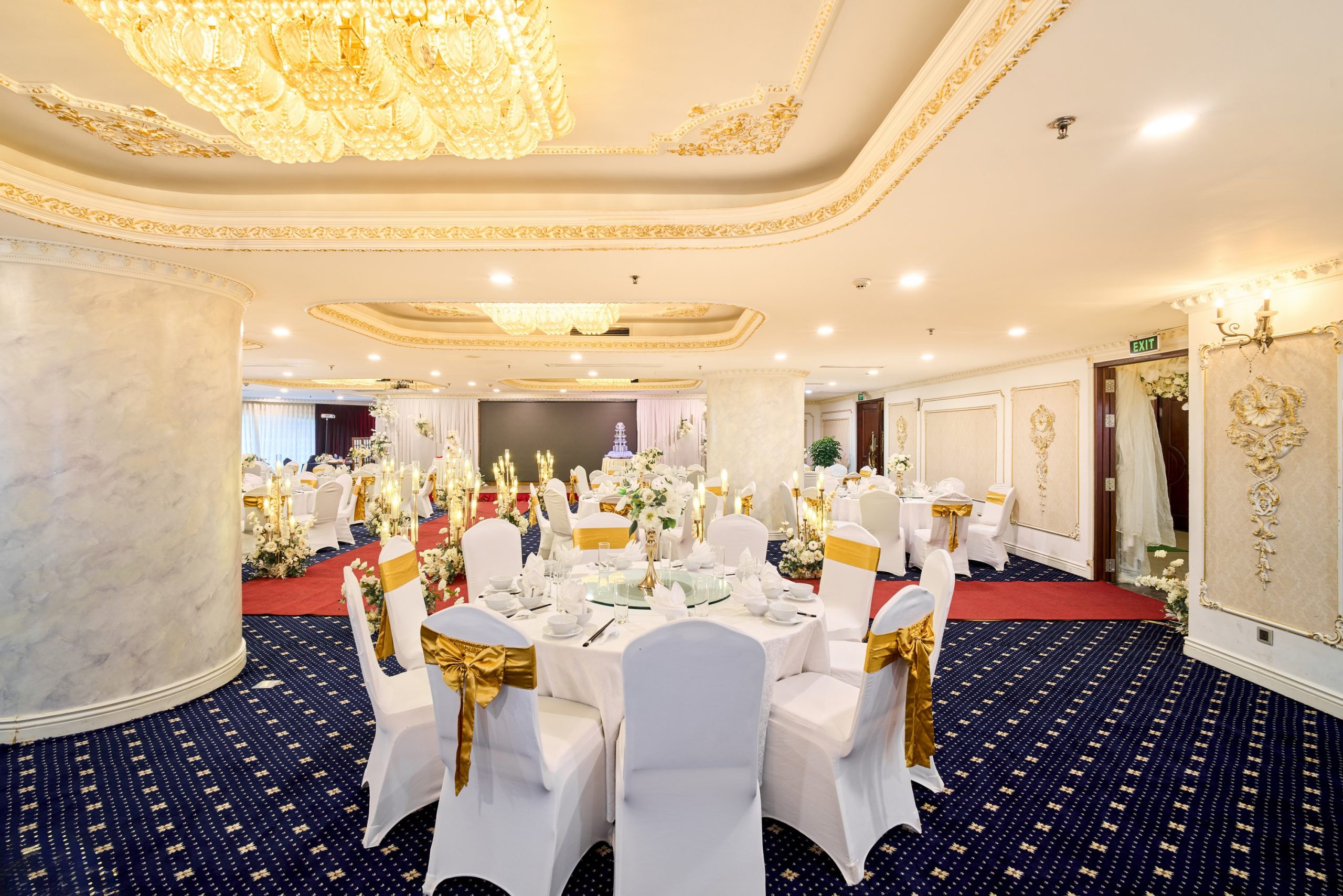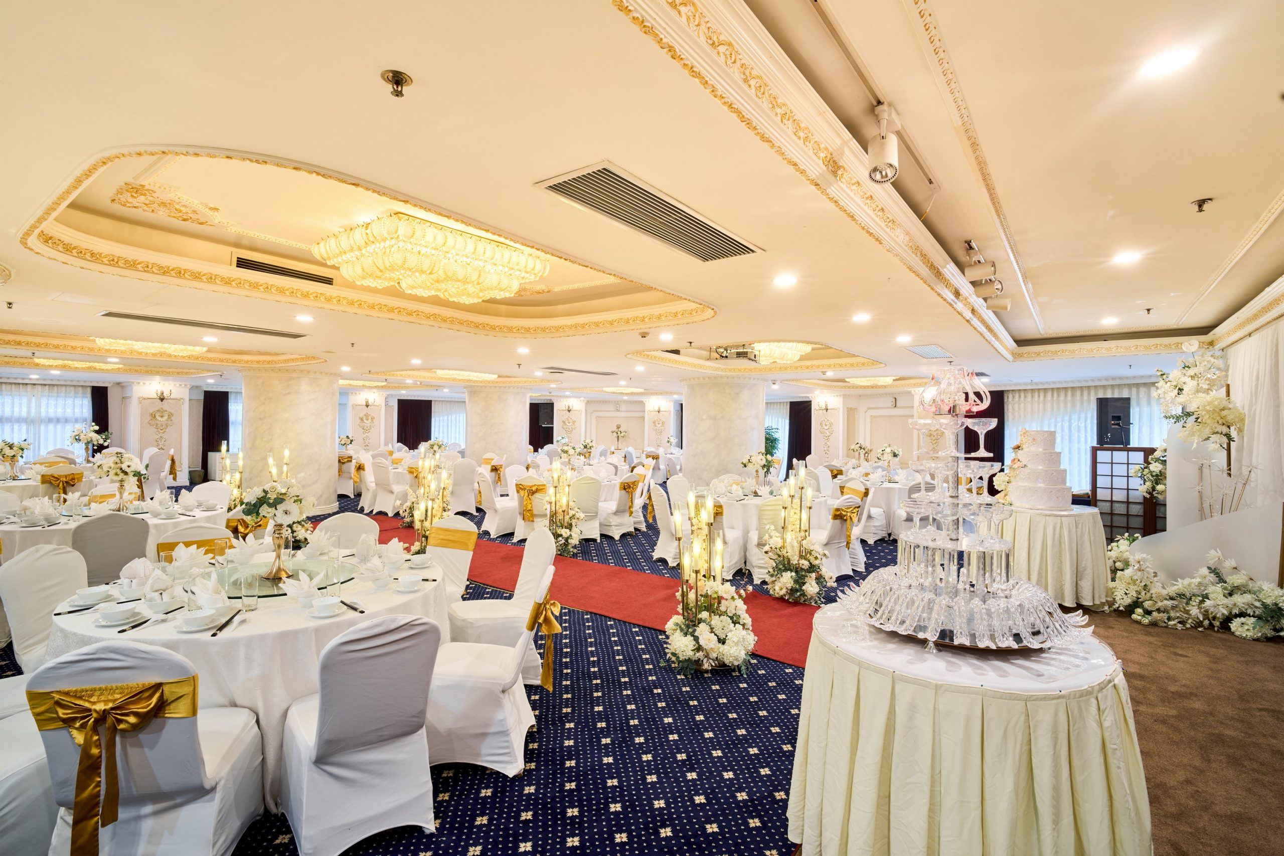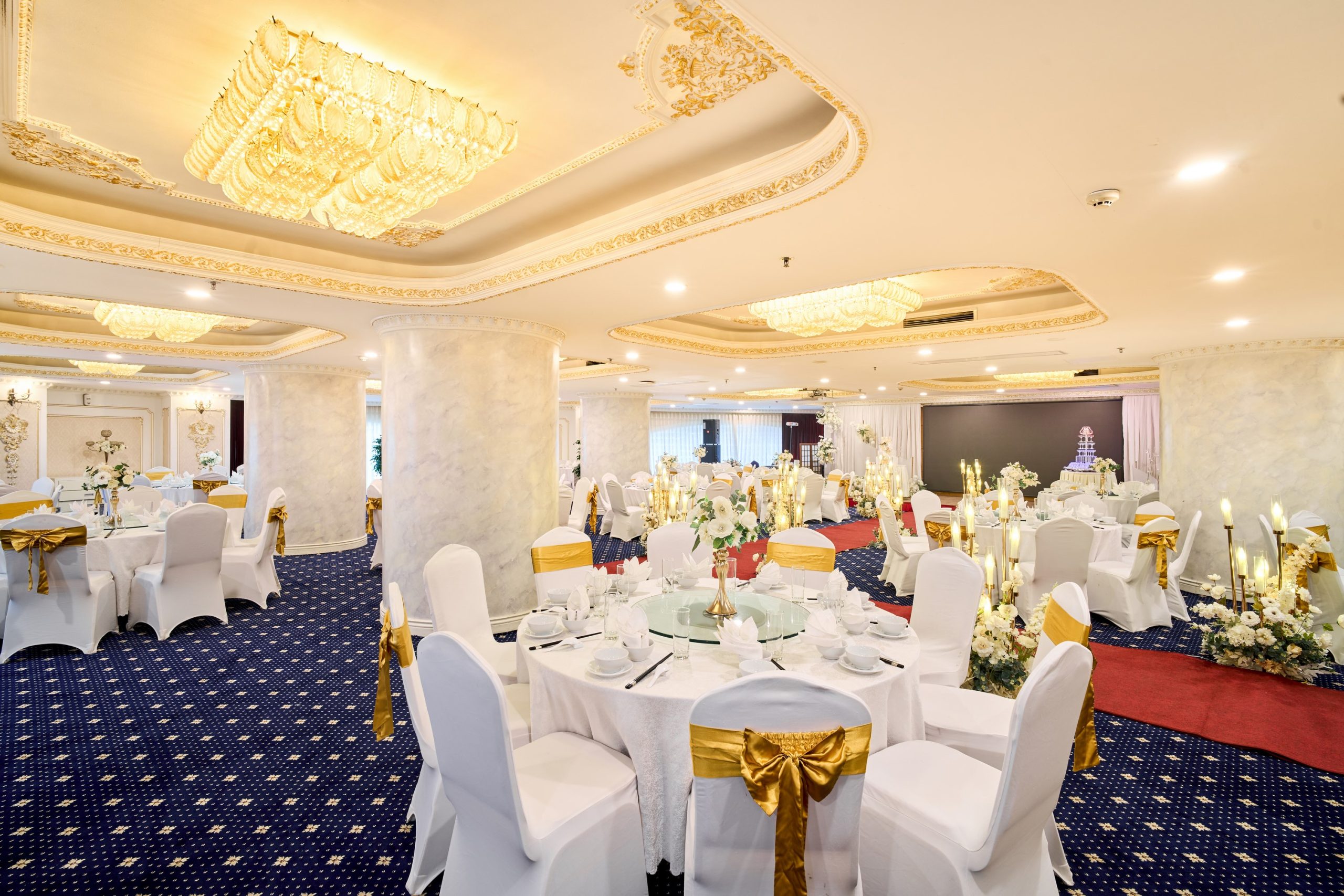 Tưởng tượng bạn và người thương bên nhau trong không gian trần cao, đèn chùm pha lê lấp lánh, và những chi tiết trang trí sang trọng, tạo nên khung cảnh đẹp như mơ cho ngày hạnh phúc.