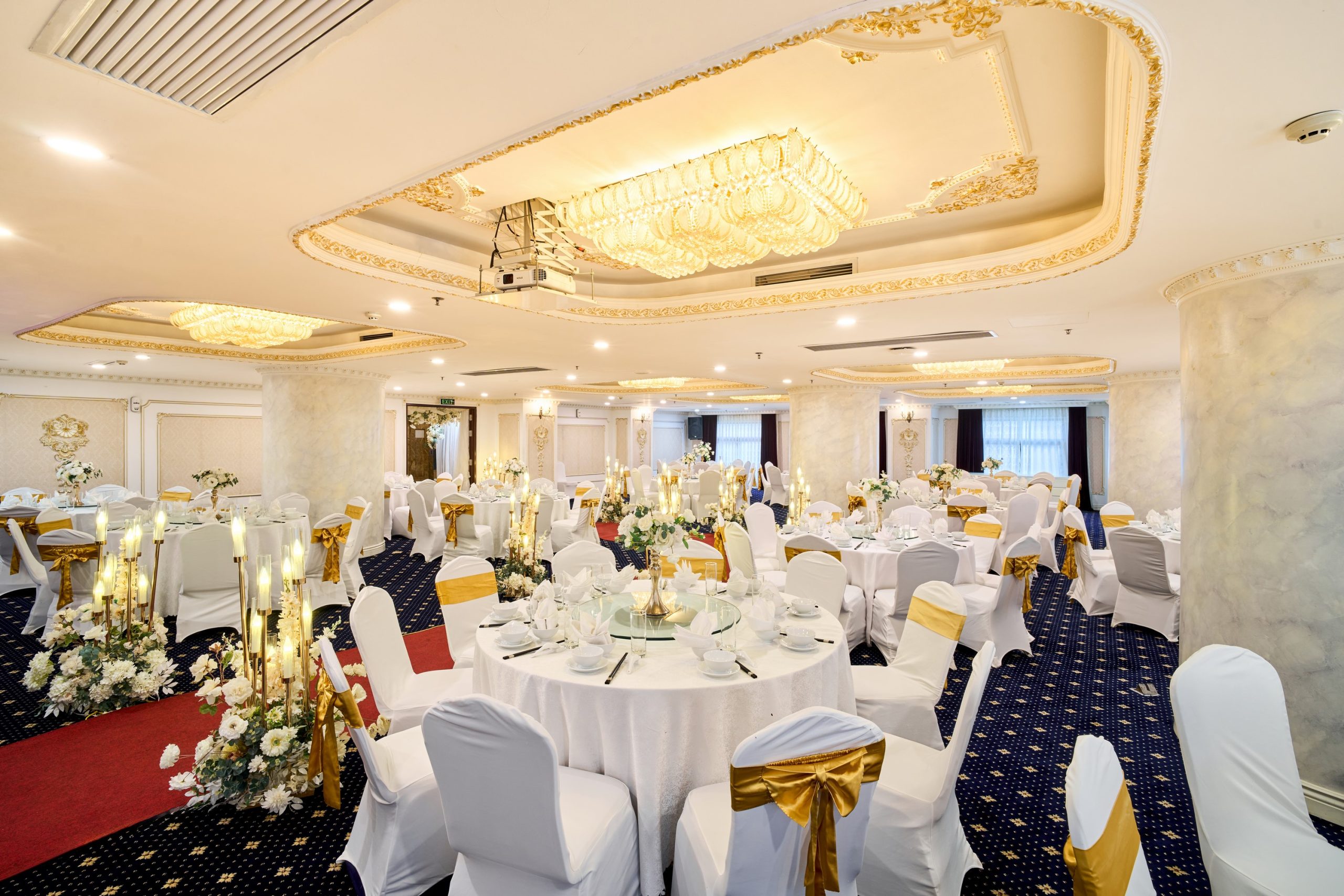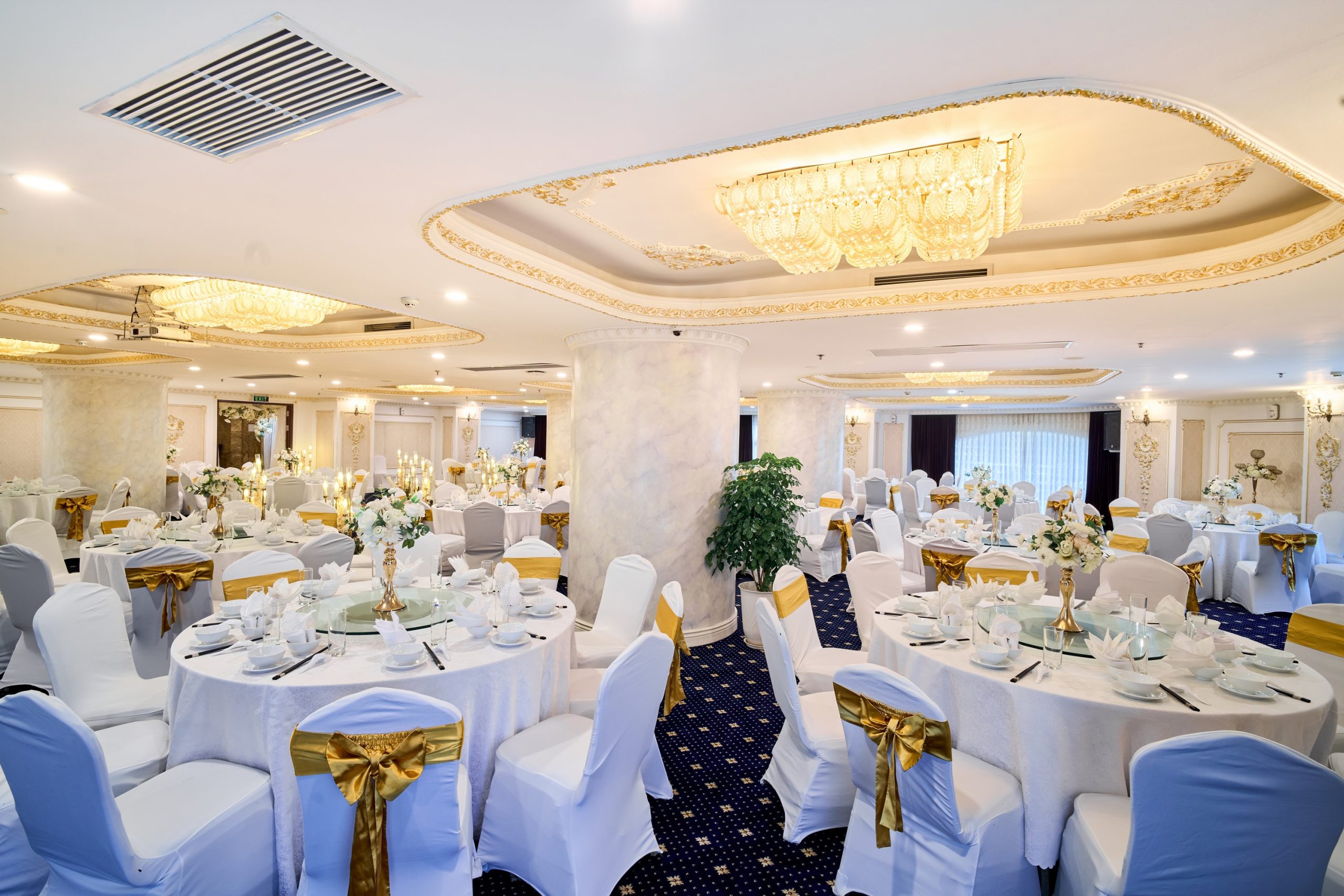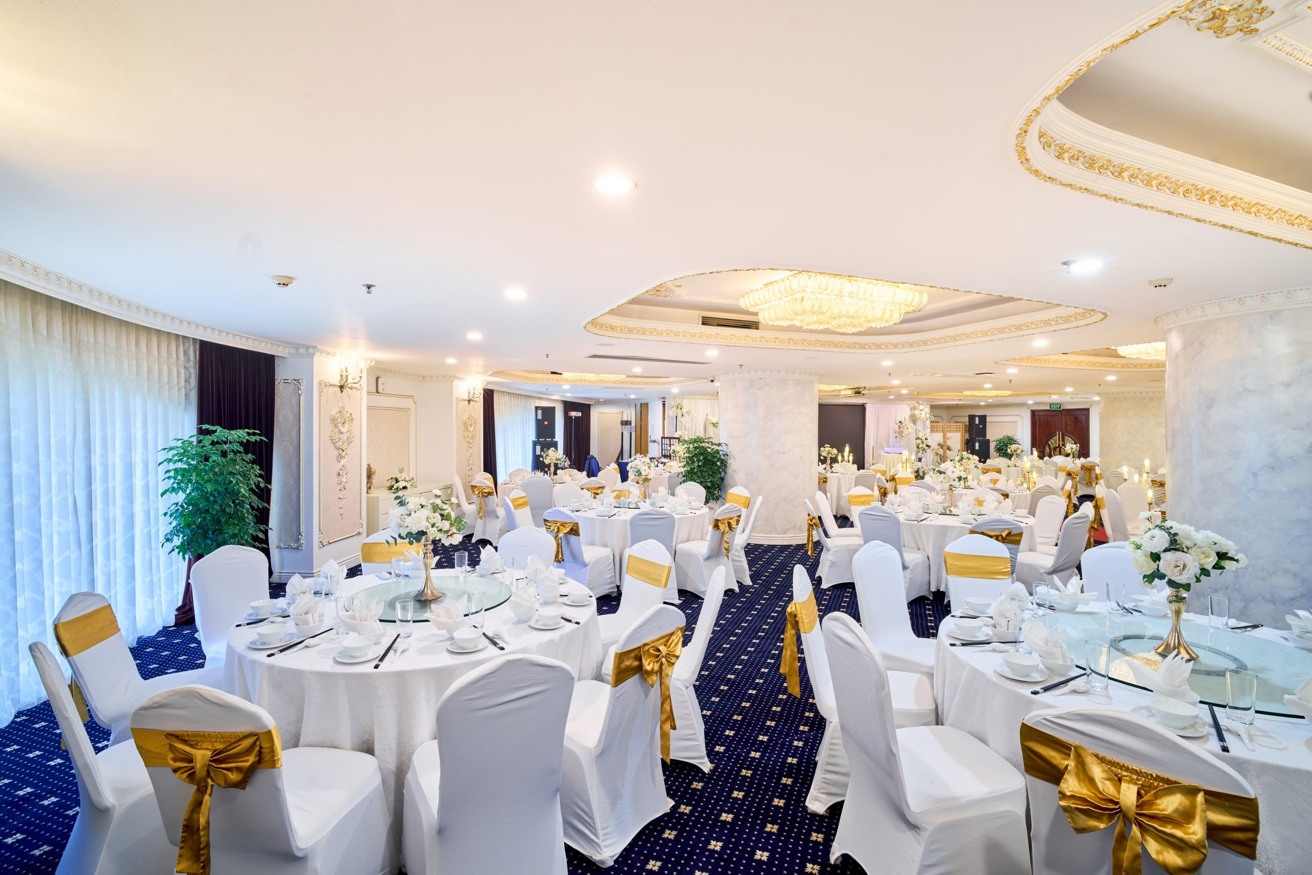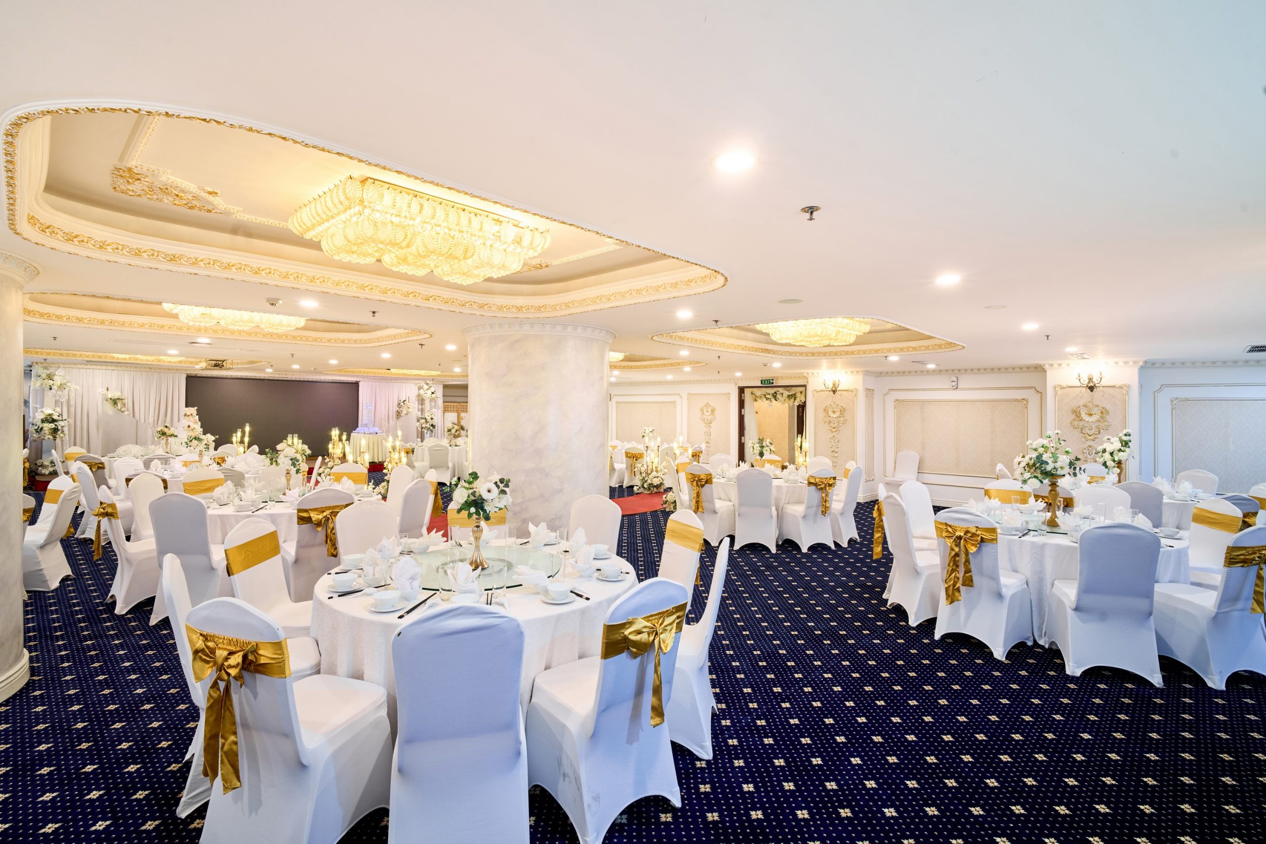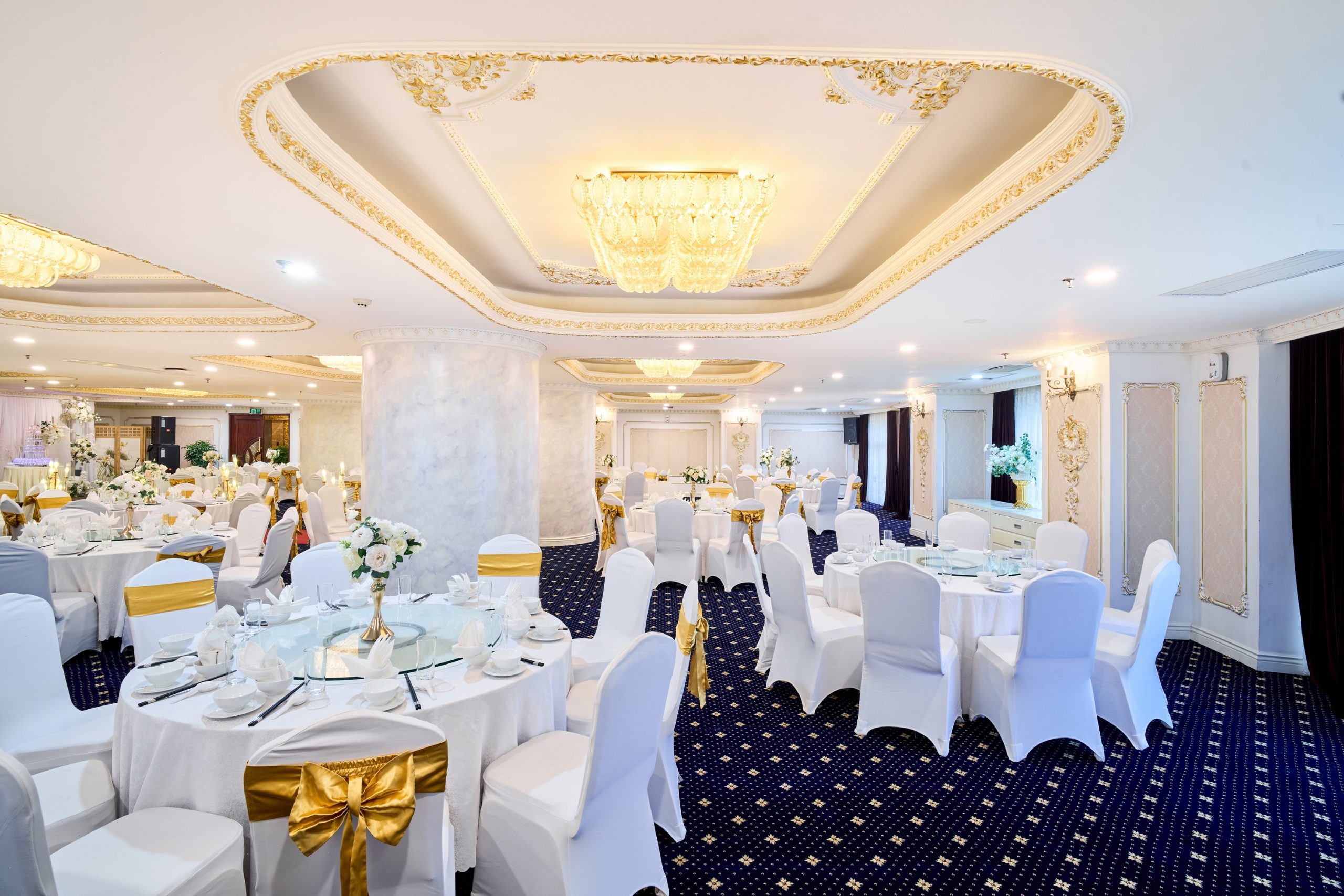 Tưởng tượng bạn và người thương bên nhau trong không gian trần cao, đèn chùm pha lê lấp lánh, và những chi tiết trang trí sang trọng, tạo nên khung cảnh đẹp như mơ cho ngày hạnh phúc.